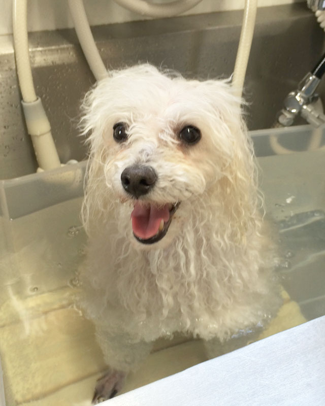 わんちゃんの皮膚の状態、汚れの状態に合わせて、ケア用品とシャンプーの組み合わせを選択しています。丁寧に汚れを落とす為に複数回繰り返しシャンプーを行います。